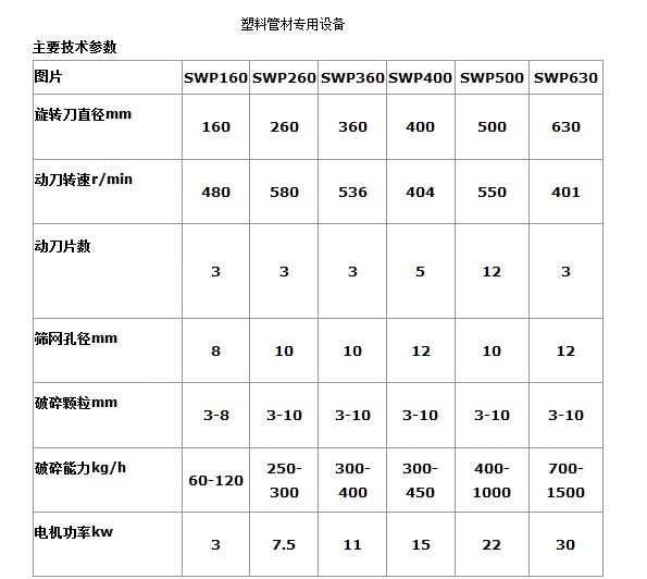 該系列破碎機主要用于破碎各種熱塑性塑料和橡膠如塑料異型材、管、棒、絲線、薄膜、廢舊橡膠制品。粒料可直接供擠出,注塑之用。SWP-400型塑料破碎機是回收大型型材,管材的理想設備。其破碎能力大、產量高、工作性能穩定,并配有自動吸料機,提高了該機的自動化程度。