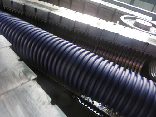 我公司在原有雙壁波紋管設備的基礎上,對于小口徑的雙壁波紋管設備進行了優化和設計。使設備價格比原來的雙壁波紋管設備降低了很多。雙壁波紋管內層和外層采用兩臺針對聚烯氫原料的高效單螺旋擠出機,特殊螺旋結構的共擠機頭,使內層和外層壁厚均勻,成型穩定,生產速度快。成型模塊采用特殊的真空成型方式,夾板串水冷卻,自動打油潤滑等特點。
